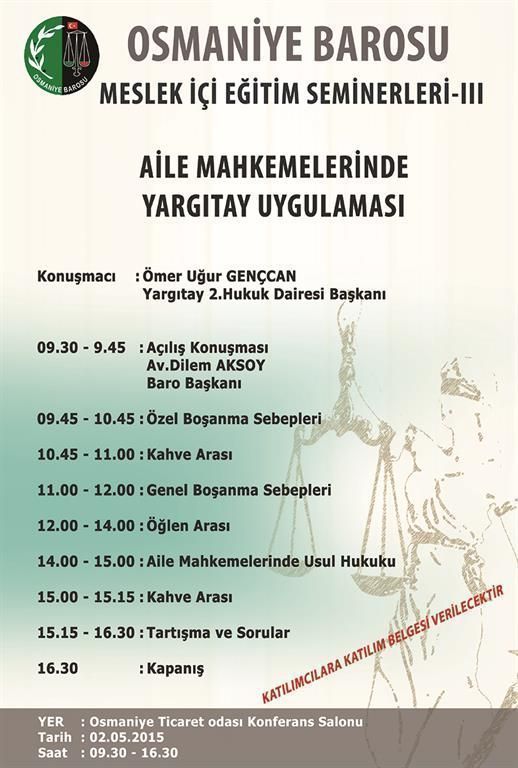 02.05.2015 Cumartesi günü saat:09.30 - 16.30 arasında Osmaniye Ticaret Odası Konferans Salonunda Yargıtay 2.Hukuk Dairesi Başkanı Ömer Uğur GENÇCAN'ın konuşmacı olarak katılacağı "Aile Mahkemelerinde Yargıtay Uygulaması" konusunda Meslekiçi Eğitim Semineri düzenlenmiştir. Seminere katılan meslektaşlarımıza Katılım Belgesi verilecektir.