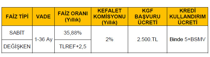 - Vade ve Geri Ödeme: 6 ay anapara ve faiz geri ödemesiz dönem imkânı ile birlikte toplamda azami 36 ay vadeli sabit ve değişken faiz oranlı kredi seçeneği bulunmaktadır.