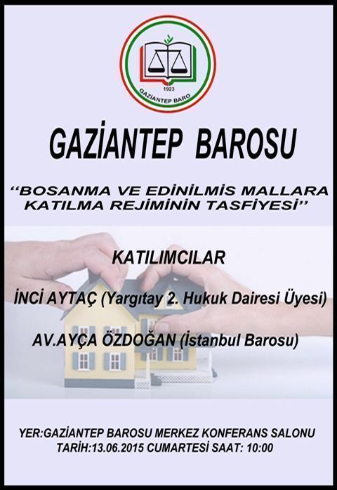 Gaziantep Barosu tarafından 13.06.2015 Cumartesi günü saat:10.00 da G.Antep Barosu Konferans Salonunda,Yargıtay 2.Hukuk Dairesi Üyesi İnci AYTAÇ ve İstanbul Barosundan Av.Ayça ÖZDOĞAN'ın katılımı ile "BOŞANMA VE EDİNİLMİŞ MALLARA KATILMA REJİMİNİN TASFİYESİ" KONULU SEMİNER düzenlenmiştir.