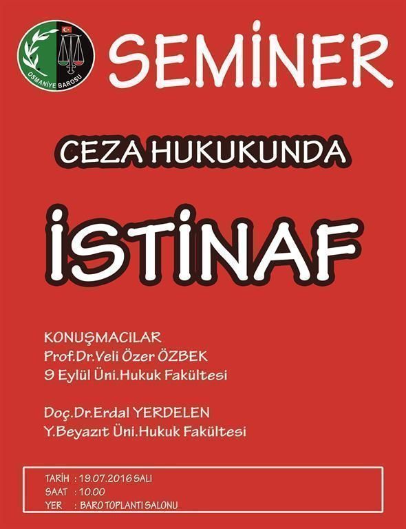 Baromuz tarafından 19.07.2016 Salı günü saat:10.00 da Baro Toplantı salonunda 9 Eylül Üniversitesi Hukuk Fakültesinden Prof.Dr.Veli Özer ÖZBEK ve Doç.Dr.Erdal YERDELEN'in katılımı ile "Ceza Hukukunda İSTİNAF" semineri gerçekleştirilecektir.