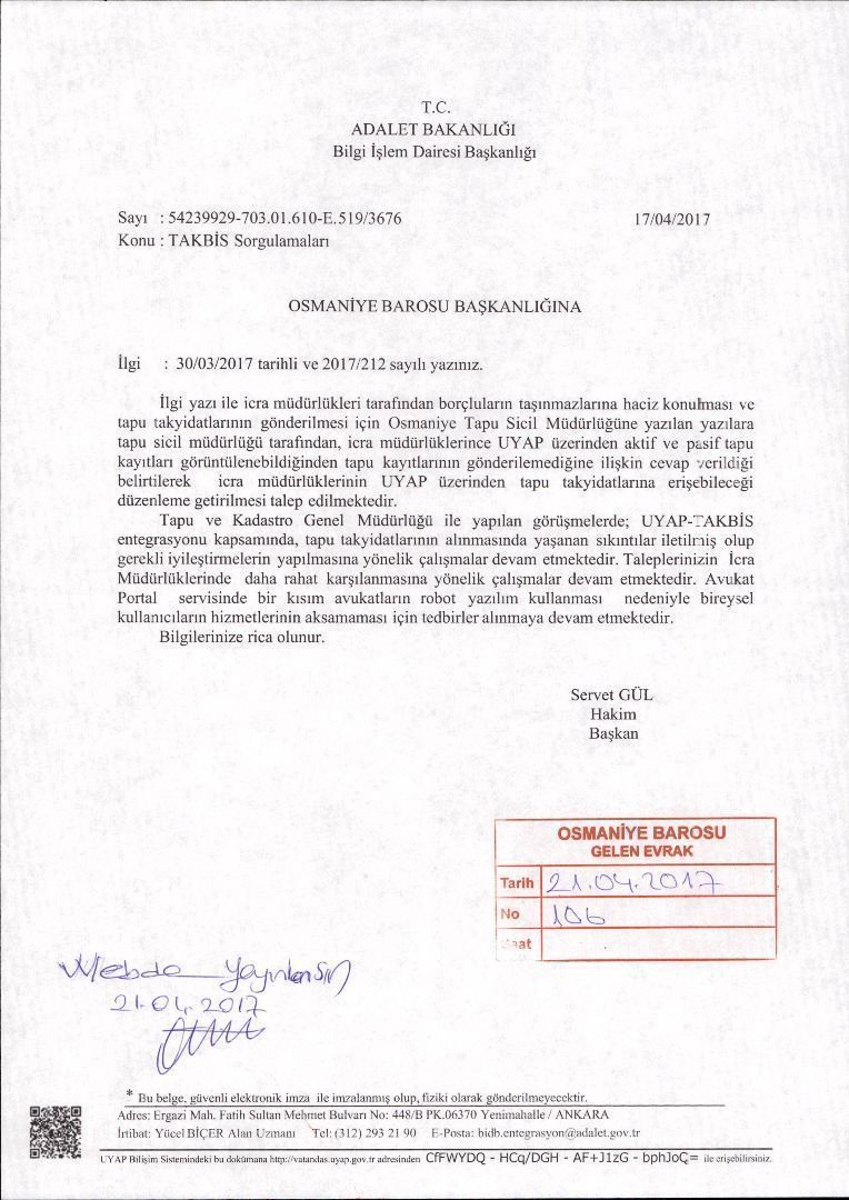 ADALET BAKANLIĞI BİLGİ İŞLEM DAİRE BAŞKANLIĞININ TAKBİS SORGULAMALARI HAKKINDA BAROMUZA YAZMIŞ OLDUĞU CEVABİ YAZI