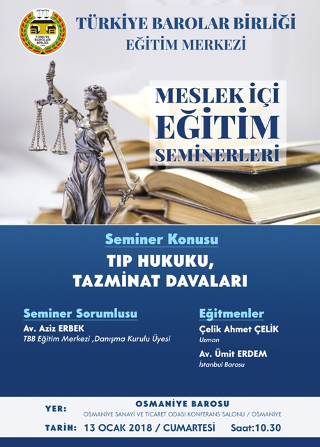 Türkiye Barolar Birliği ve Osmaniye Barosu işbirliği ile 13.01.2018 Cumartesi günü saat:10.30 da Osmaniye Ticaret ve Sanayi Odası Konferans Salonunda TBB Eğitim Merkezi Danışma Kurulu Üyesi Adana Barosu avukatı Aziz ERBEK'in seminer sorumlusu olarak ve Tıp Hukuku,Tazminat Davaları Uzmanı Çelik Ahmet ÇELİK ile İstanbul Barosu Avukatlarından Ümit ERDEM'in konuşmacı olarak katılacağı "TIP HUKUKU,TAZMİNAT DAVALARI" konusunda Meslek içi Eğitim Semineri düzenlenecektir. Seminere katılan meslektaşlarımıza TBB tarafından Katılım Belgesi verilecektir.