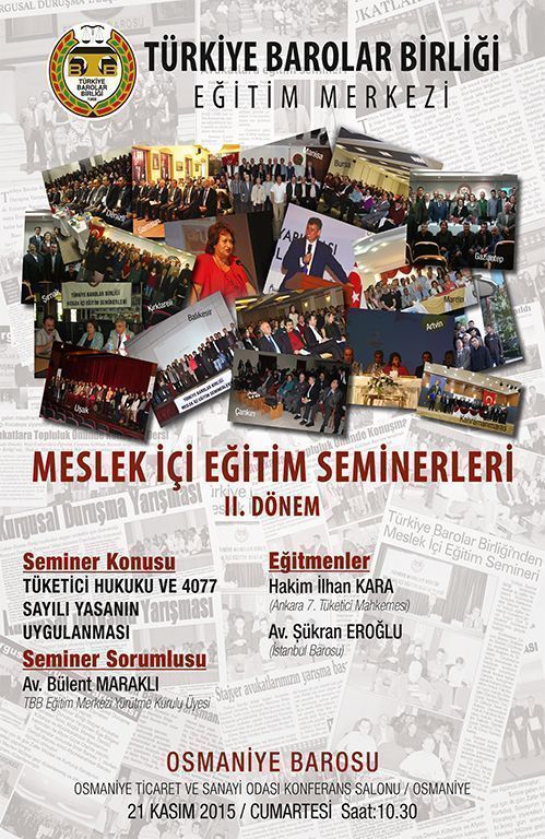 21.11.2015 Cumartesi günü saat:10.30 da Osmaniye Ticaret Odası Konferans Salonunda Ankara 7.Tüketici Mahkemesi Hakimi İlhan KARA ve İstanbul Barosu Avukatlarından Av. Şükran EROĞLU'nun konuşmacı olarak katılacağı "Tüketici Hukuku ve 4077 Sayılı Yasanın Uygulanması" konusunda Meslek içi Eğitim Semineri düzenlenmiştir.Seminere katılan meslektaşlarımıza TBB tarafından Katılım Belgesi verilecektir.