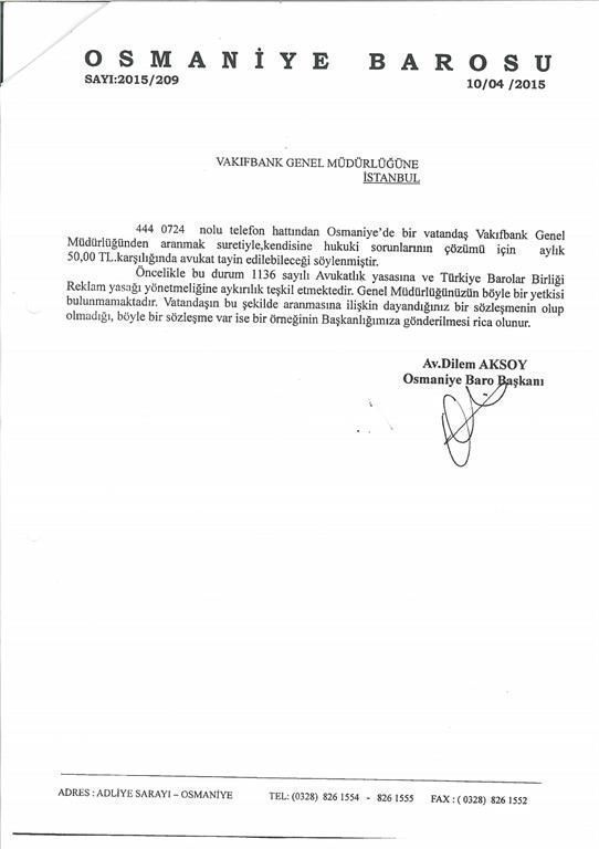 Osmaniye Barosu olarak Vakıfbank Genel Müdürlüğüne yazdığımız yazı ve yazı cevabını sayın meslektaşlarımızınbilgilerine sunarız.